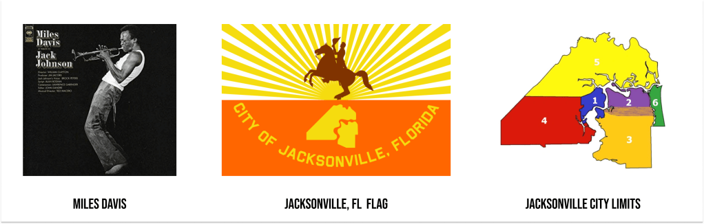 My inspiration is drawn from different places. Fist, her pose is a “clin d’oeil” to Miles Davis’ iconic pose, the background was inspired by the Jacksonville flag, and her hair is the shape of the city borders: